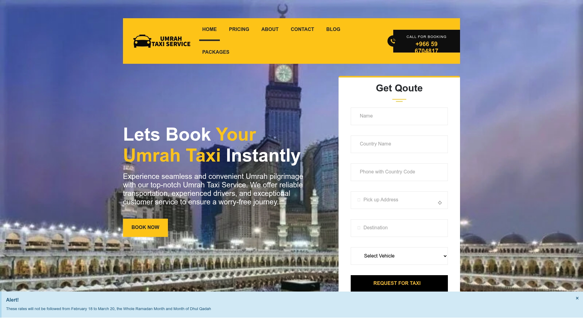 | Umrah Taxi Service | Sedan to luxury vans, online booking with instant quotes | Multiple vehicle options, professional drivers, website indicates service coverage | Rates increase during peak seasons, requires direct confirmation for specific routes | Rates vary, higher pricing during Hajj and Ramadan |