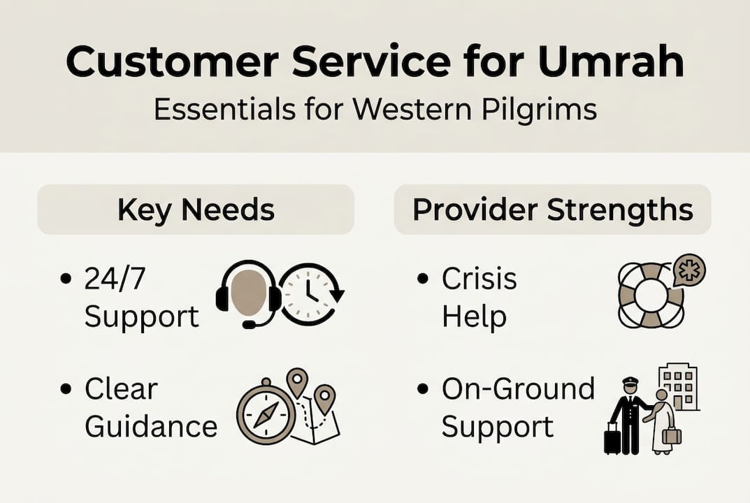 24/7 multilingual support, responsive on-ground teams, and reliable crisis management are the three pillars that determine whether a Western pilgrim's journey runs smoothly or falls apart under pressure.