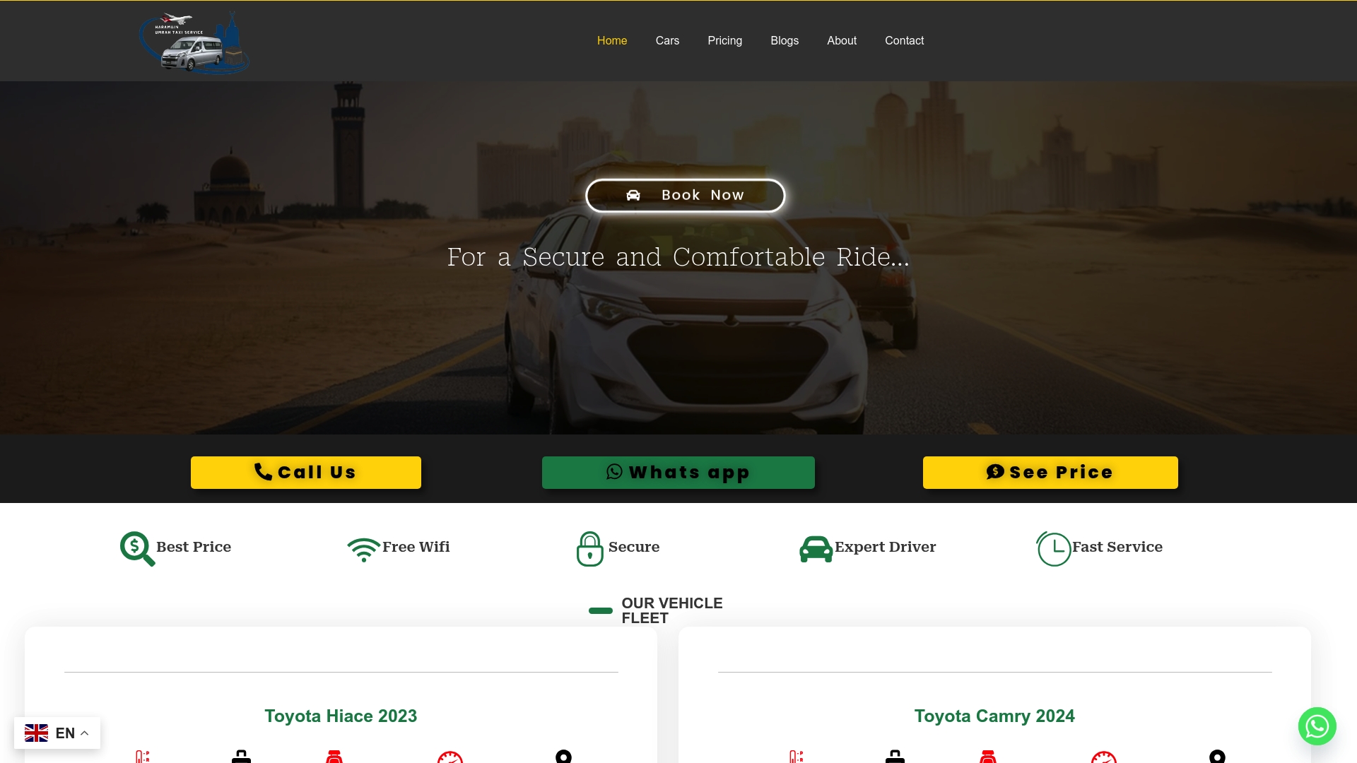 The service provides airport transfers, city and intercity rides, and guided Ziyarat tours delivered by professional drivers. Vehicles are described as comfortable and well maintained and the platform supports both short term and long term car rental options with online reservations. The emphasis is on reliability and simple booking.