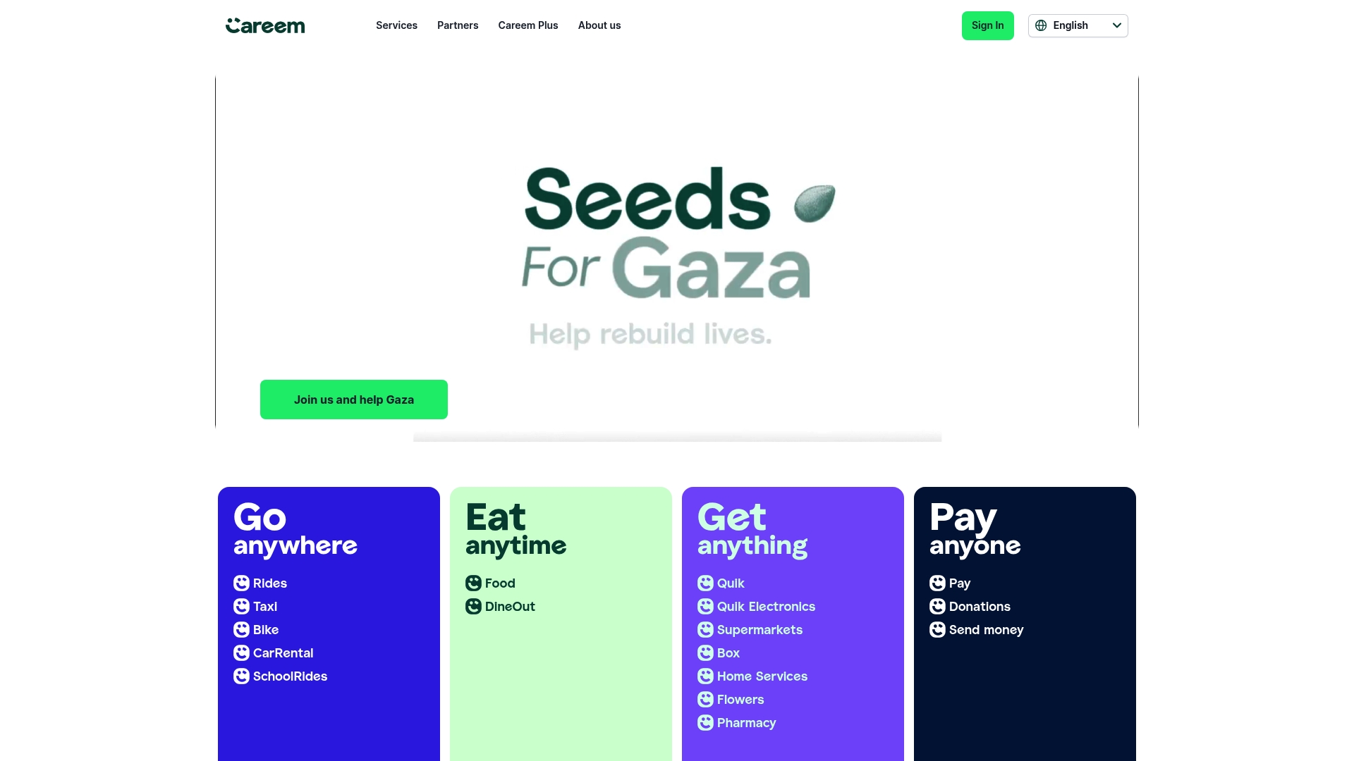 Careem combines Ride-hailing services, Food delivery, Grocery and essentials delivery, Home and lifestyle services, and Payment services into a single app experience. The platform supports taxis, bikes, car rentals, school rides, restaurant deliveries, grocery boxes, pharmacy orders, and money transfers.