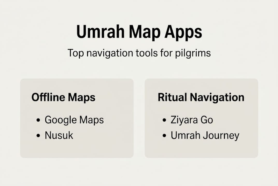 Recommended apps for Umrah include Google Maps for general navigation, the Nusuk official app with interactive maps and ritual guidance, and specialist tools like Umrah Journey and Ziyara Go that offer offline maps of Mecca and Medina. Each serves a different purpose, and using more than one is the smart move.