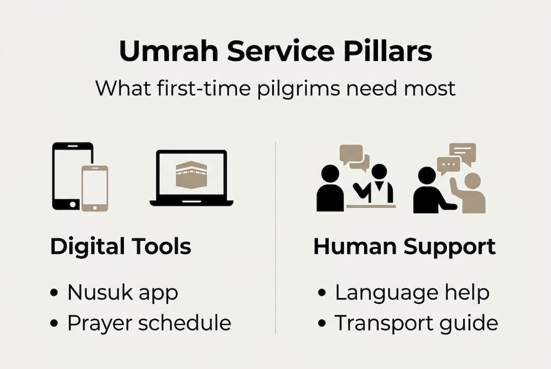 Quality support for Umrah pilgrims comes in two forms: digital and human. Both have strengths. Neither works best alone.