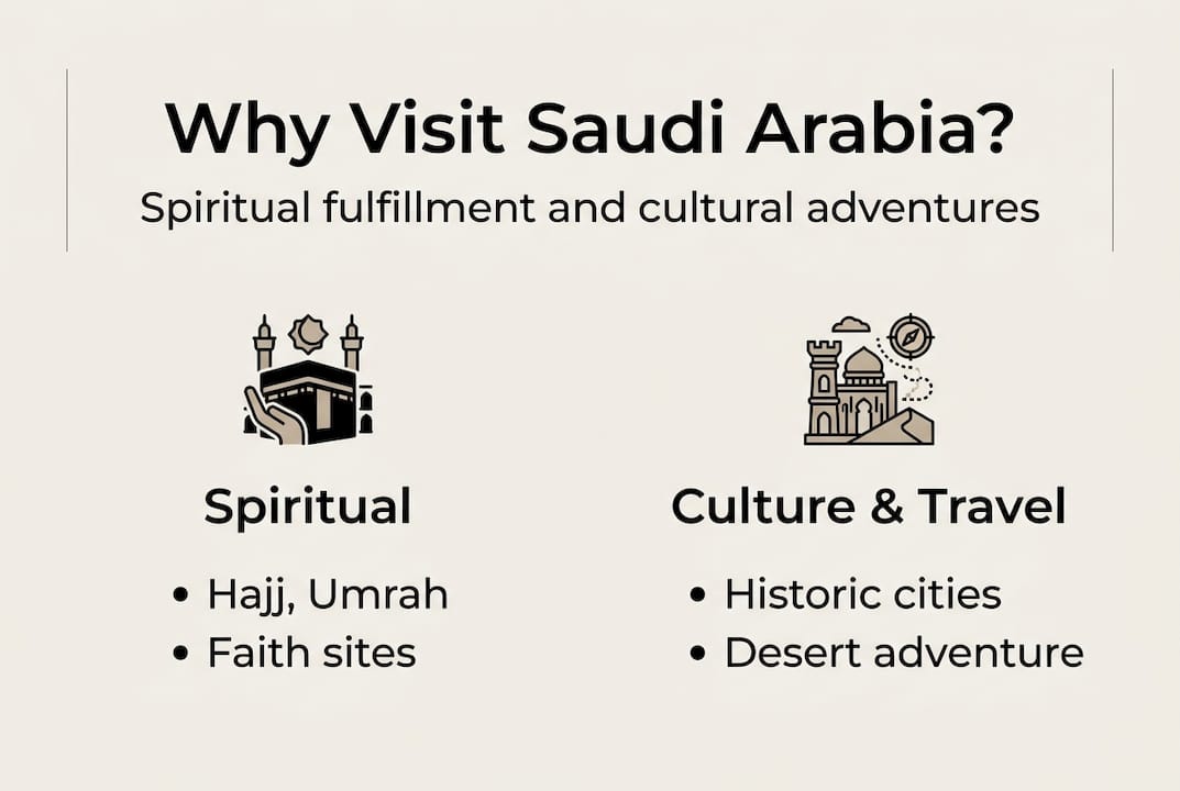 | Spiritual fulfillment | Saudi Arabia offers transformative faith experiences unlike anywhere else. |
